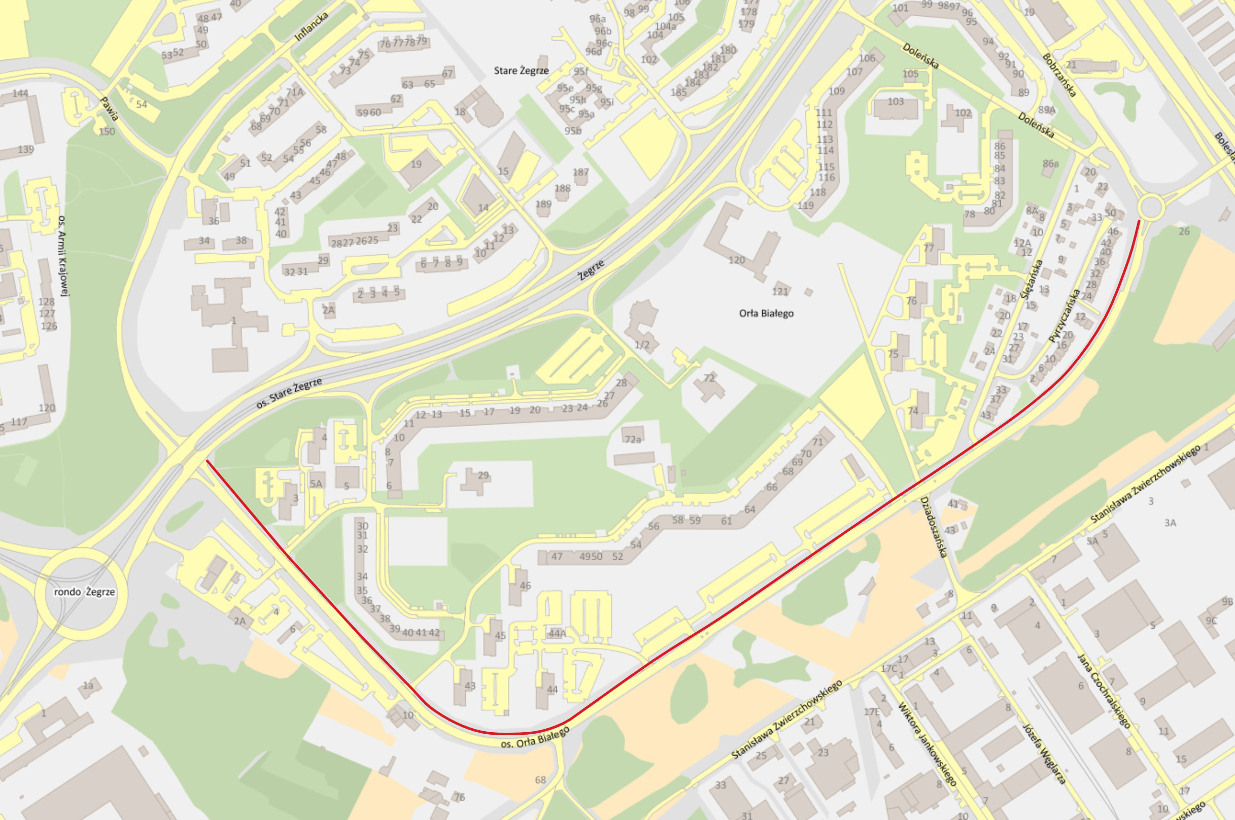 Projekt zakłada wyznaczenie drogi pieszo-rowerowej wzdłuż ul. Kurlandzkiej od ul. Żegrze w kierunku wiaduktu nad ul. Bolesława Krzywoustego (po stronie osiedla Orła Białego) wraz z obniżeniem krawężników na wjazdach/wyjazdach z dróg osiedlowych i wyznaczeniem przejazdów dla rowerzystów w ciągu drogi. Pozwoli to na wygodny i bezpieczny dojazd do Ronda Żegrze i dalej do Ronda Starołękę i nad Wartostradę, a po stronie ul. Bobrzańskiej połączy się z nowymi drogami dla rowerów na rondach i na wiadukcie nad ul. B. Krzywoustego.