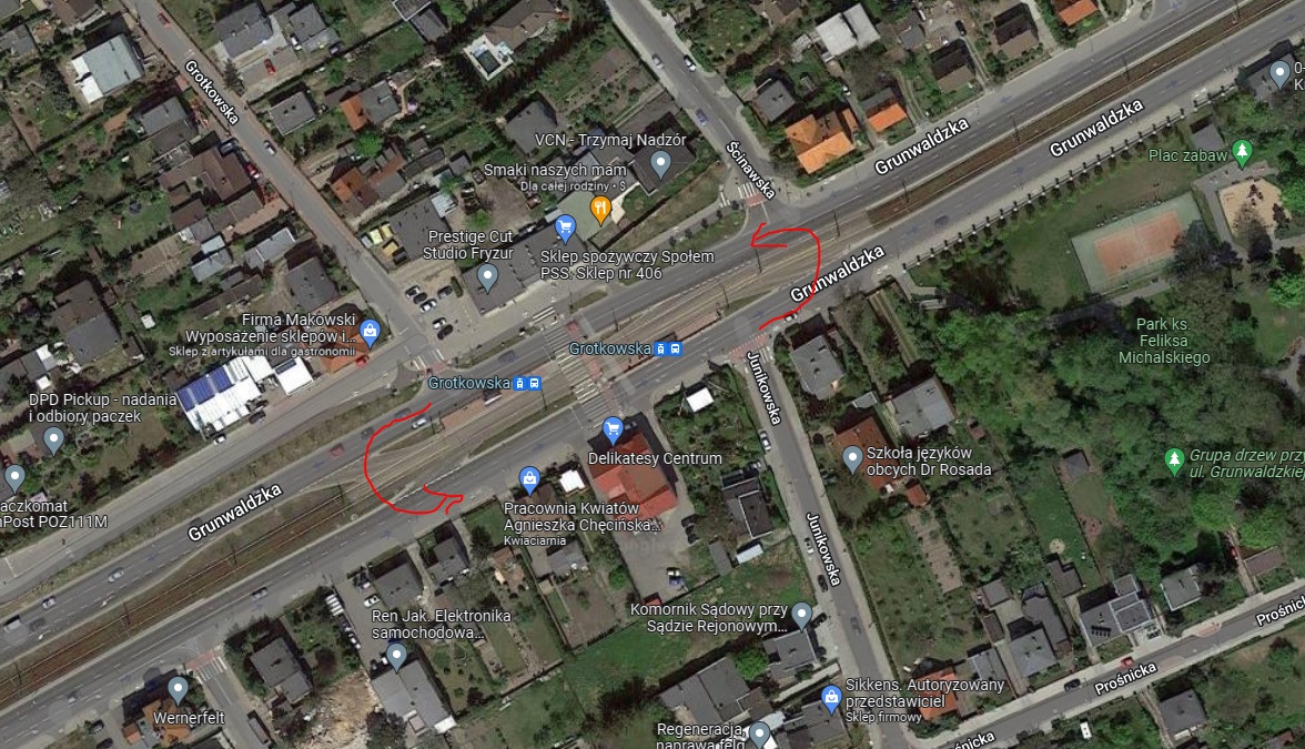 Zrealizowanie przejazdu przez tory tramwajowe za jak i przed przystankiem tramwajowym ul. Grotkowska. Umożliwi łatwiejszy wjazd na osiedle jak i przejazd w kierunku centrum. Aktualnie znajdują się już tutaj wjazdy i zjazdy dla autobusów na przystanek tramwajowy. Wystarczyłoby tylko rozbudować to miejsce (utwardzić nawierzchnię między torami tam gdzie jeszcze jej nie ma) i oznakować.